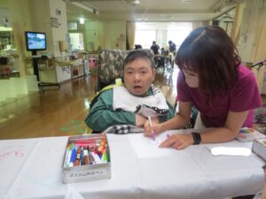 電気点検のため、一部電気がつかない場所がある中、3チームに分かれて、のぼり旗を作製しました。
