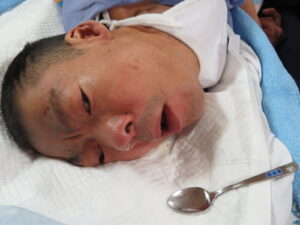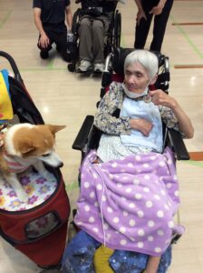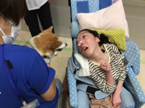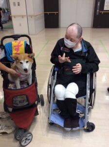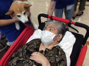 かわいい犬と触れ合えて、表情が和らいでいました。